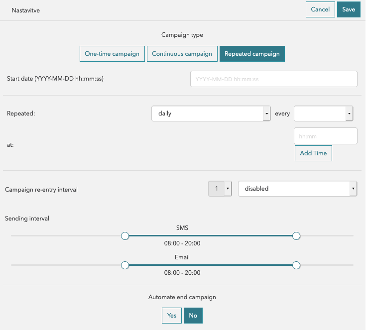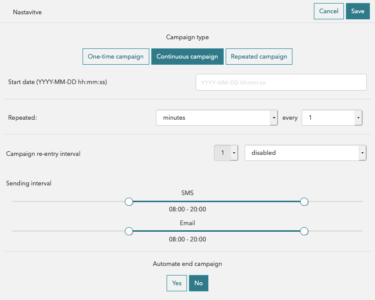 The continuous campaign contains all of the previous settings, with the addition of the “Repeated” section. This allows setting the time interval - how often the campaign will repeat itself (i.e. every hour).