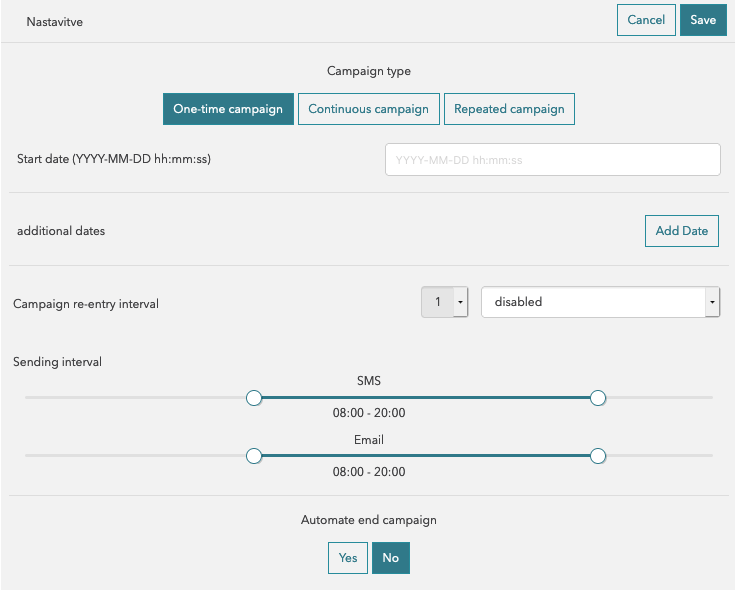 Sending interval: defines intervals from and to when the campaign will be sending messages to the target group.