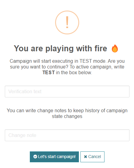 To successfully activate the campaign, verification text must be entered. In case the campaign is set as a test campaign, TEST must be entered, otherwise, LIVE to activate the live campaign.